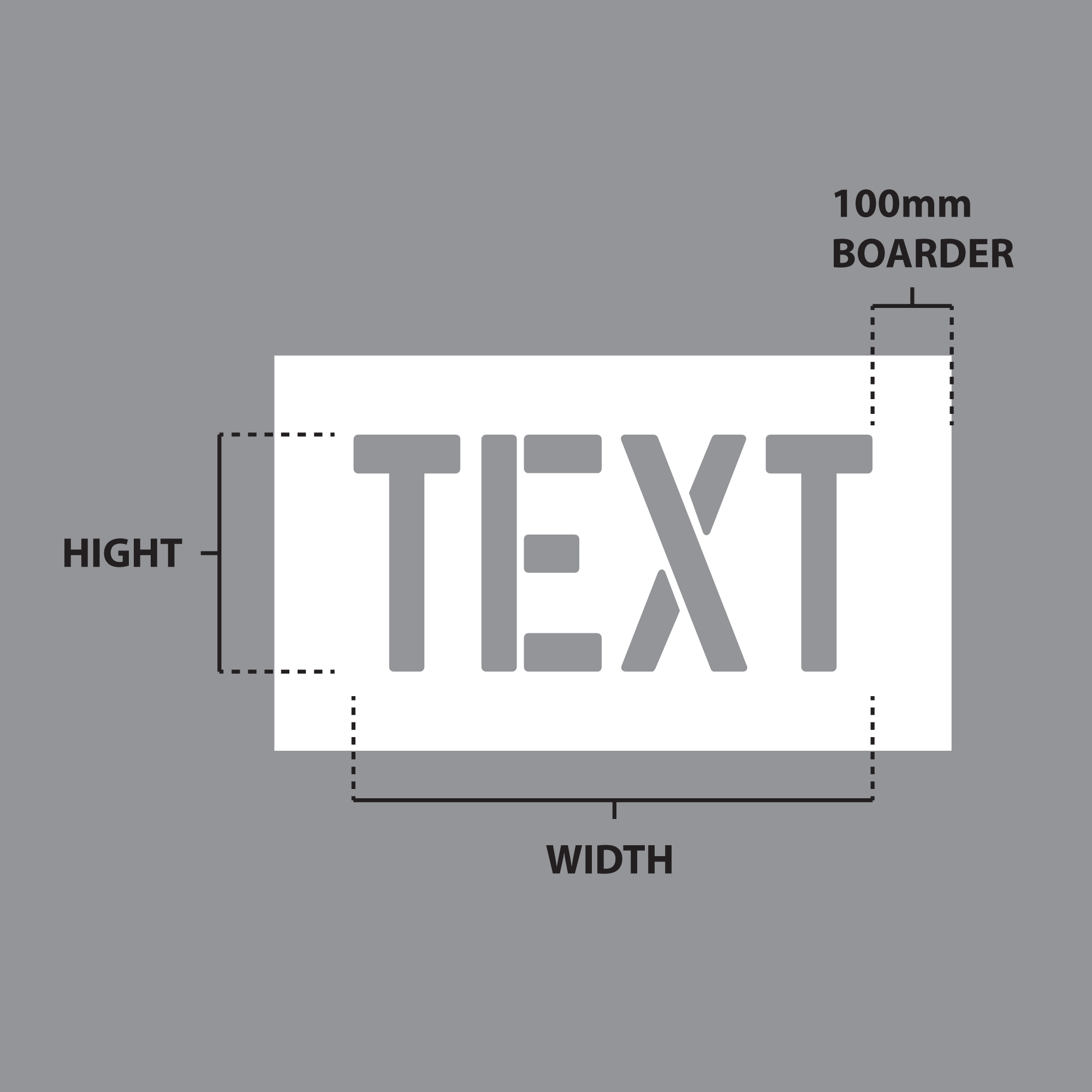 The stencil measurements refer to the height of the text or symbol itself, with an additional 100mm border of material around the design for overspray protection and easy handling.